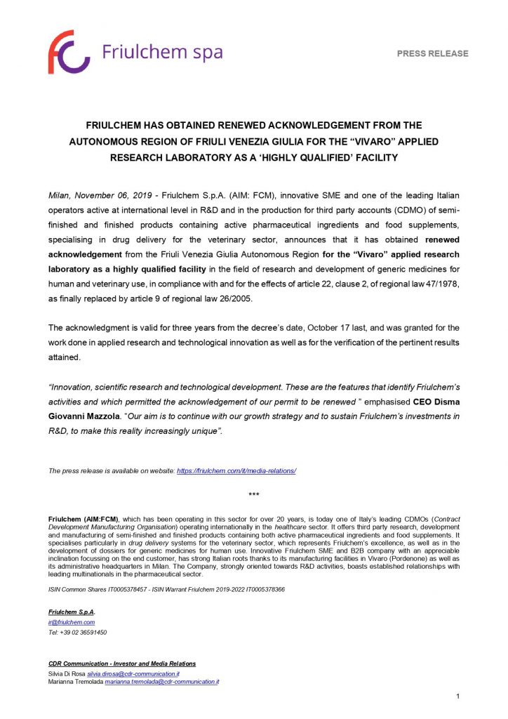 Friulchem obtained from Regione FVG the renewal of Vivaro’s Applied Research Laboratory accreditation as a highly skilled facility in the veterinary and human generic drug R&D field.